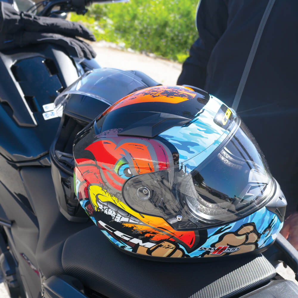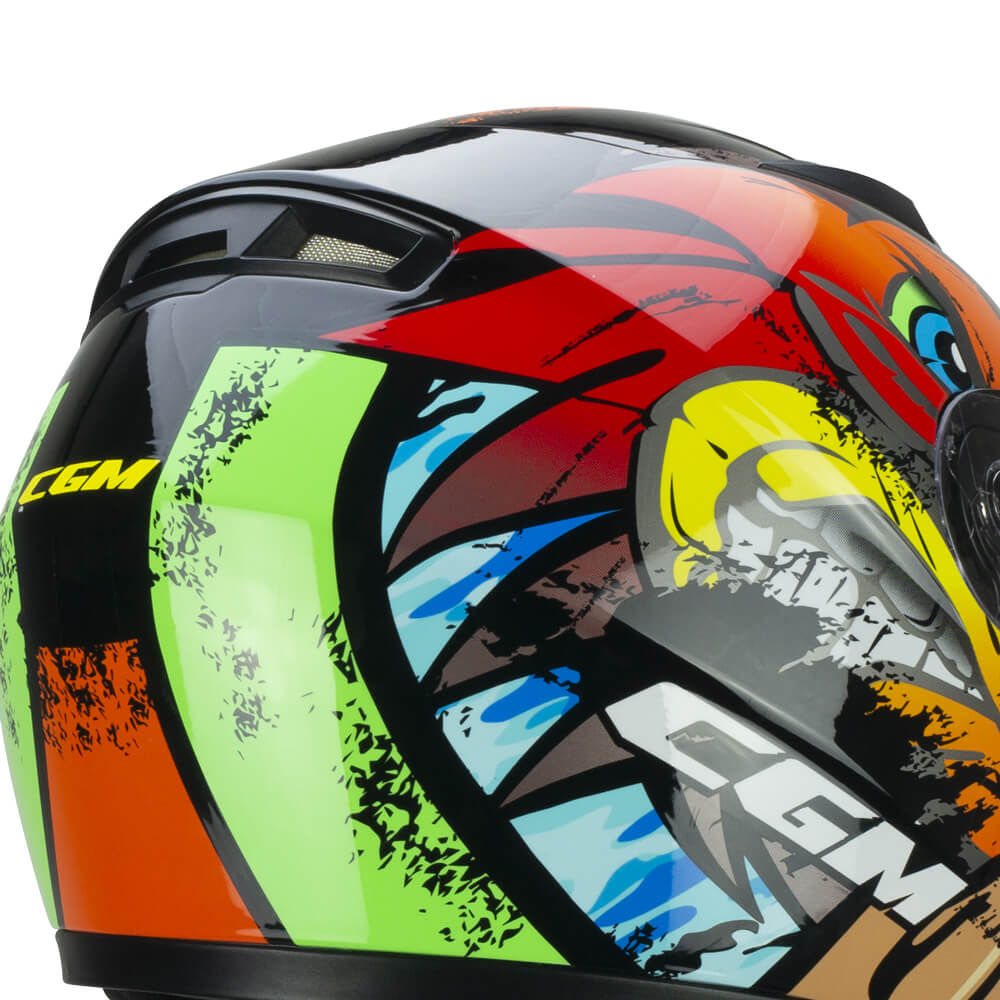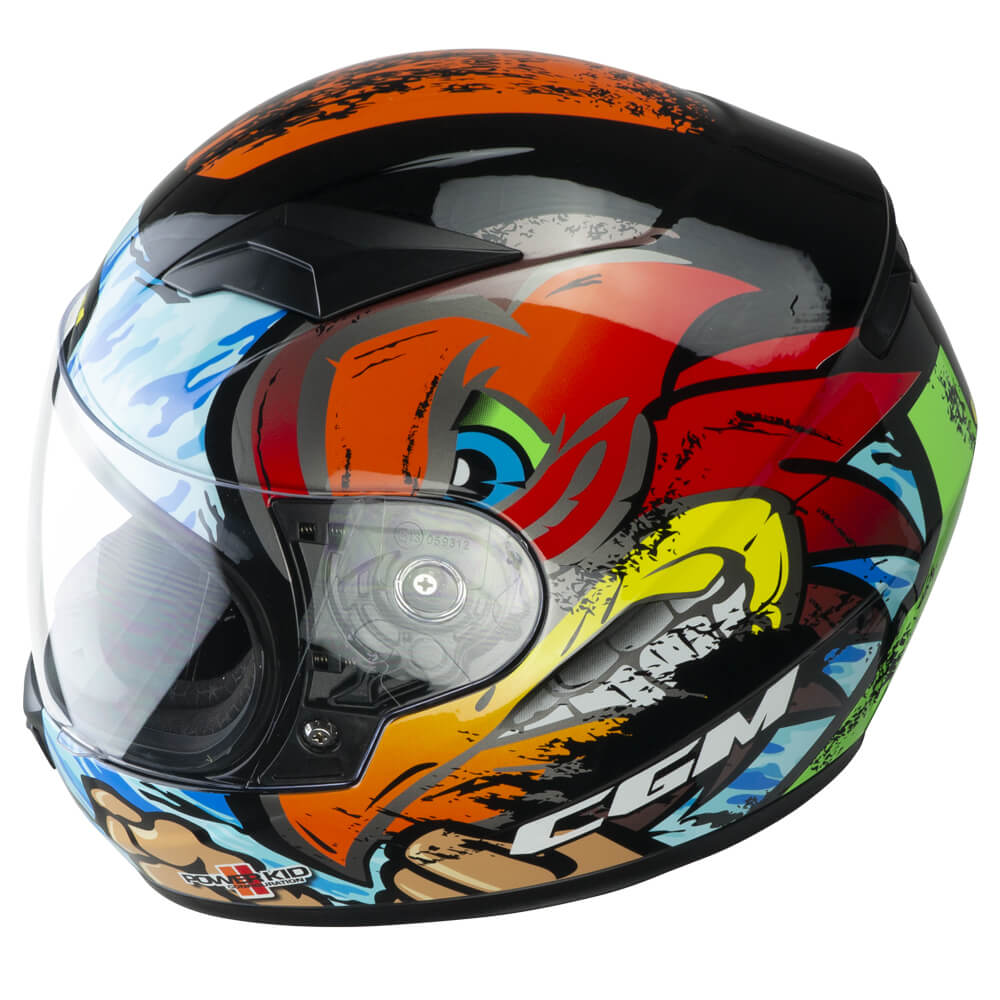 Casco ligero con tamaños realizados teniendo en cuenta la conformación de la cabeza de los más pequeños, caracterizado por gráficos cautivadores para una protección segura y divertida de los jóvenes bikers. Equipada con una pantalla larga basculante antiarañazos con cierre rápido y un sistema de ventilación Air Stream System de tres zonas con canalización interna. Interior hexagonal termoformado extraíble para una mayor comodidad de uso, de tejido ExtraCool con costuras en contraste. El equipo se completa con un deflector nasal, un deflector de barbilla y un tope de correa elástico.