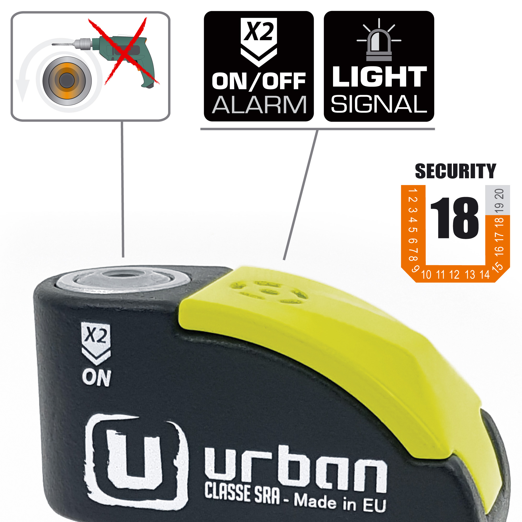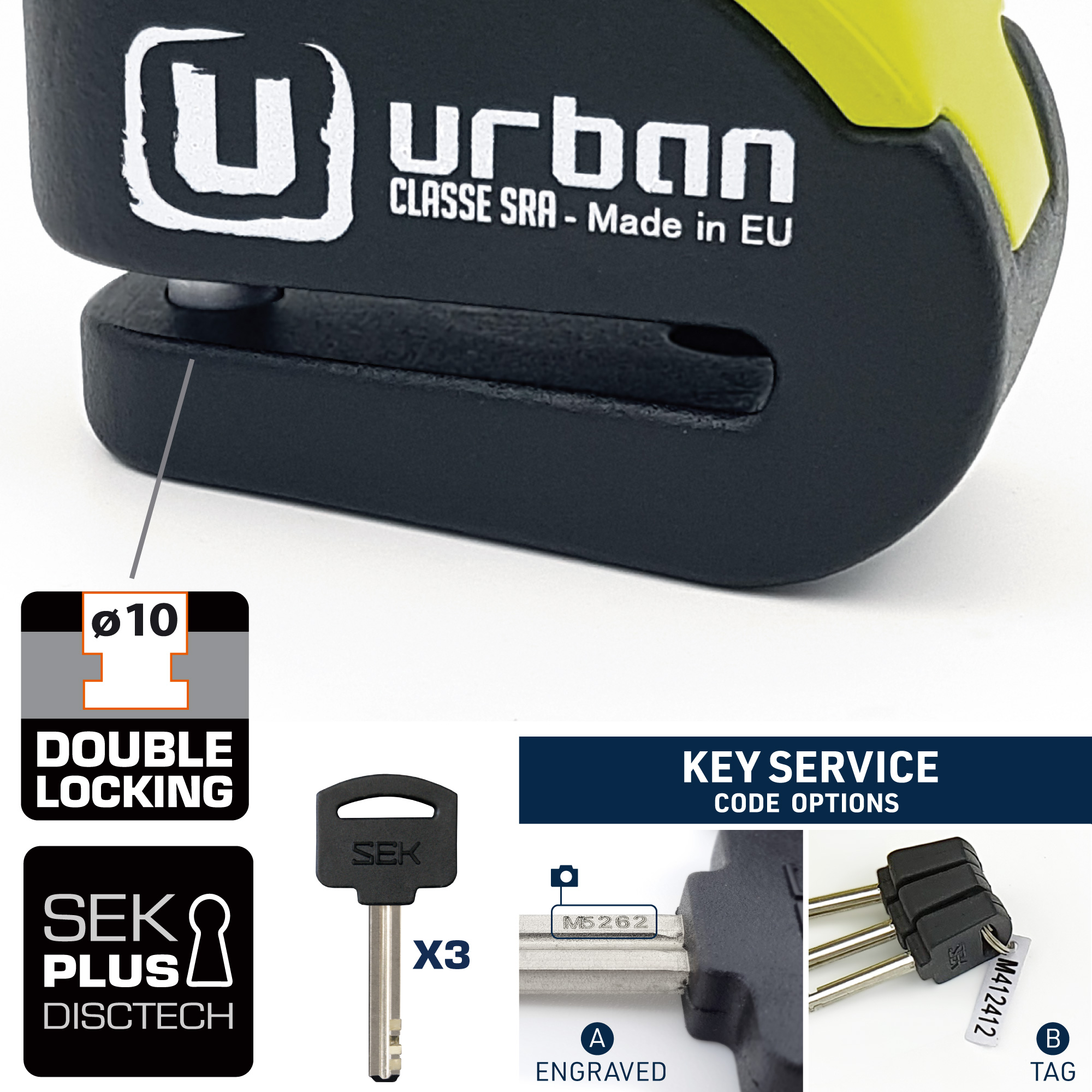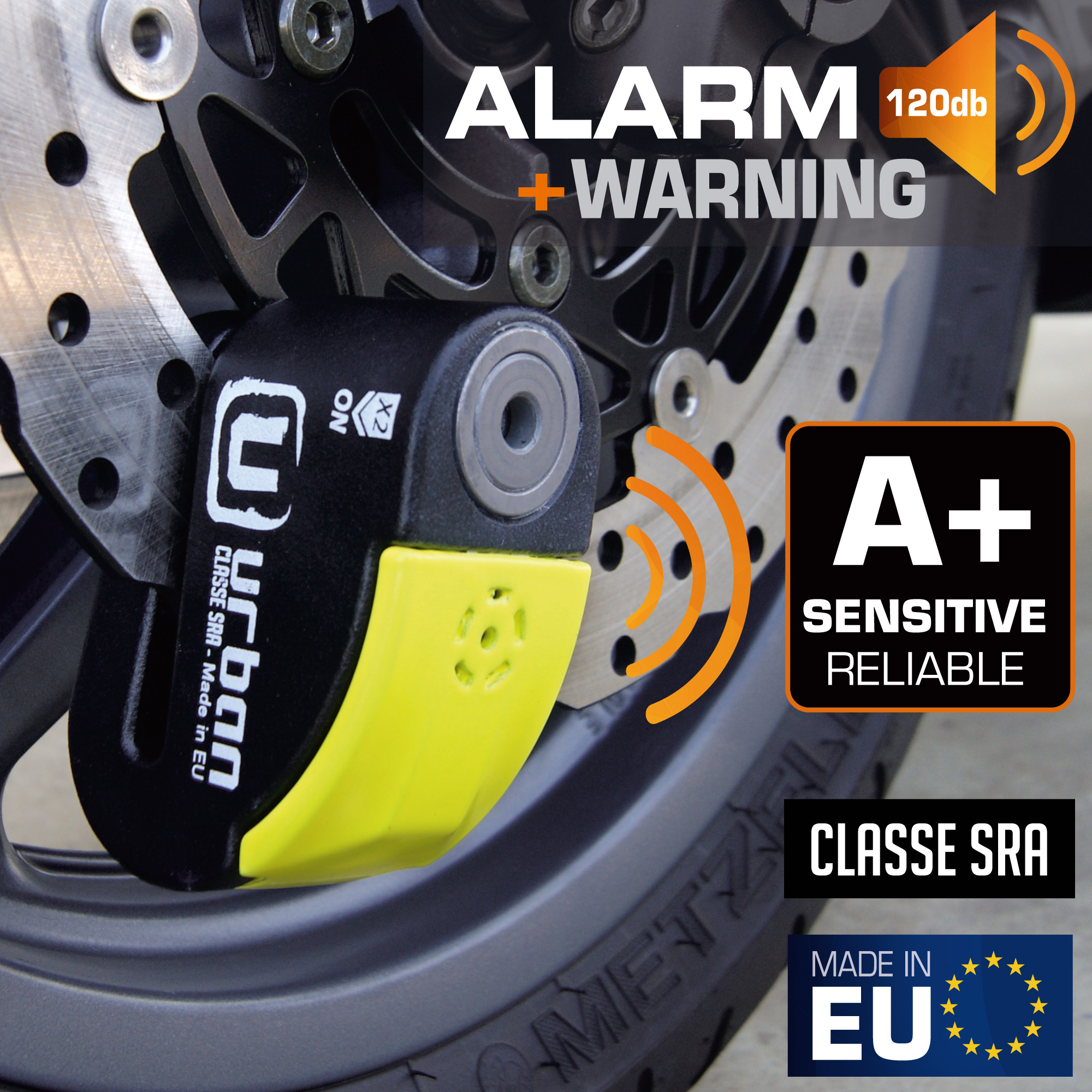 El antirrobo de disco con alarma URBAN UR10 está homologado CLASSE SRA, además incorpora la cerradura de última generación SEK PLUS DISCTECH y tiene un eje de cierre de diámetro 10, con el innovador sistema de doble cierre que bloquea el eje tanto por la parte de la cerradura como por la base. Duplicando así su resistencia a los posibles ataques.