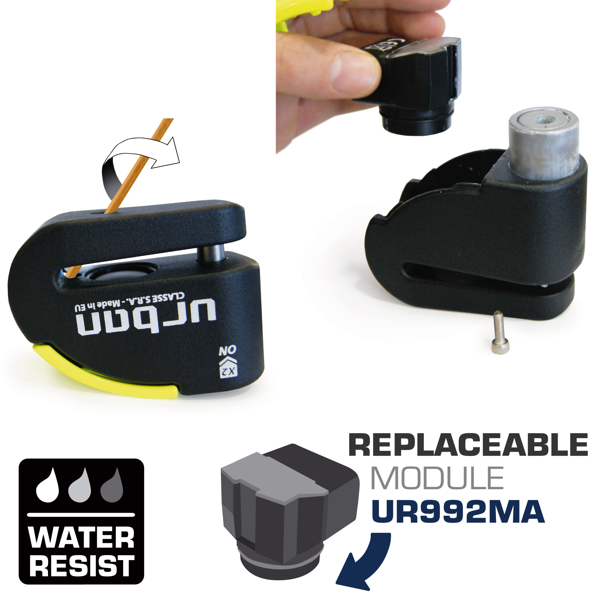 Su módulo inteligente UR992MA ALARM+ WARNING es capaz de diferenciar entre robo y olvido. Una vez activada la alarma si el antirrobo es atacado, o alguien toca tu moto, o te subes sin acordarte de que tienes el antirrobo puesto, primero sonará un avisador de 6 bips junto con el led luminoso como función avisador. Dentro de los siguientes 5 segundos si alguien toca la moto, o resulta que es un ataque real, la alarma junto al led luminoso se dispara a su máxima potencia, por el contrario si no hay más ataques el sensor vuelve a estado de alerta evitando así que salte la alarma de manera innecesaria. Este sistema alarga la vida de las baterías (CR2) y evita molestias como falsas alarmas. Además puede evitar que tengas un posible accidente al intentar poner la moto en marcha con el antirrobo puesto en el disco.