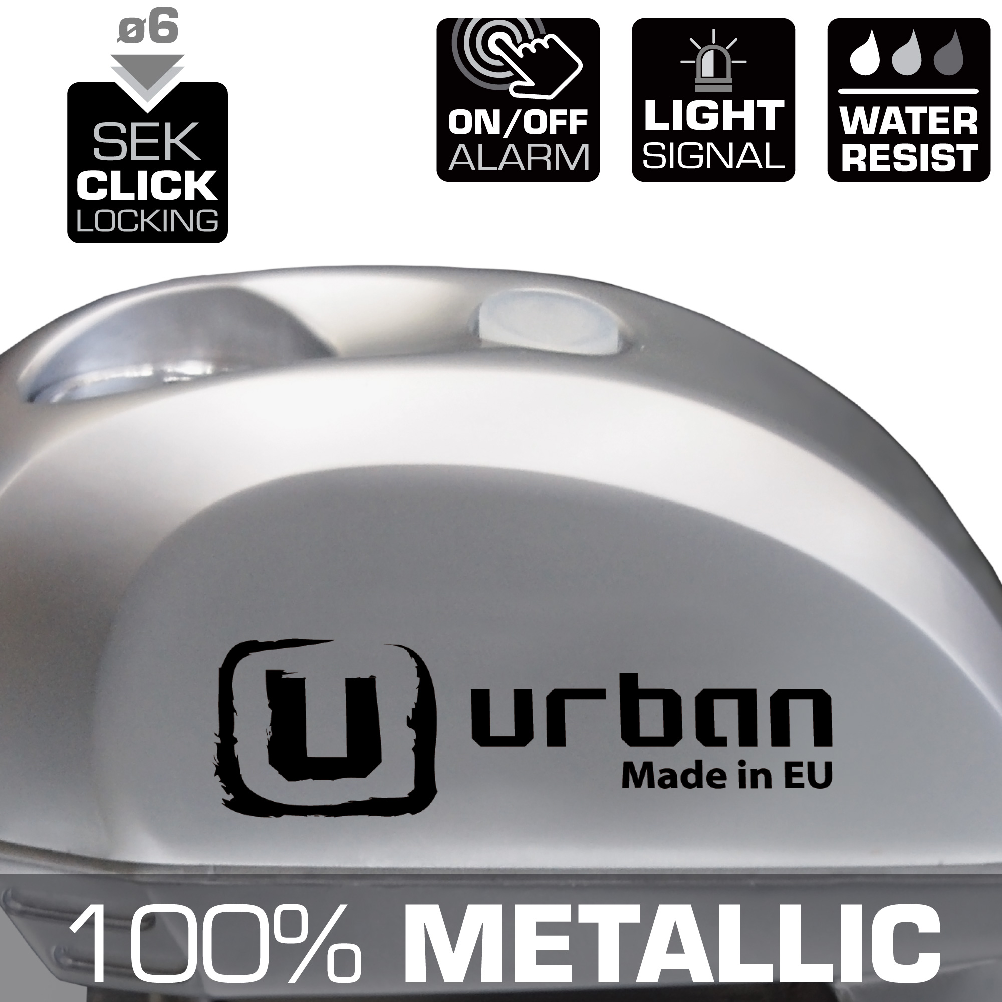 Tanto el cuerpo como la tapa son 100% de metal, fabricado en Europa con los máximos estándares de calidad y las más avanzadas técnicas de producción. Además no nos olvidemos de su novedosa cerradura SEK CLICK con eje de cierre de acero endurecido diámetro 6, universal para moto y scooter que nos permite cerrarlo con una sola mano.