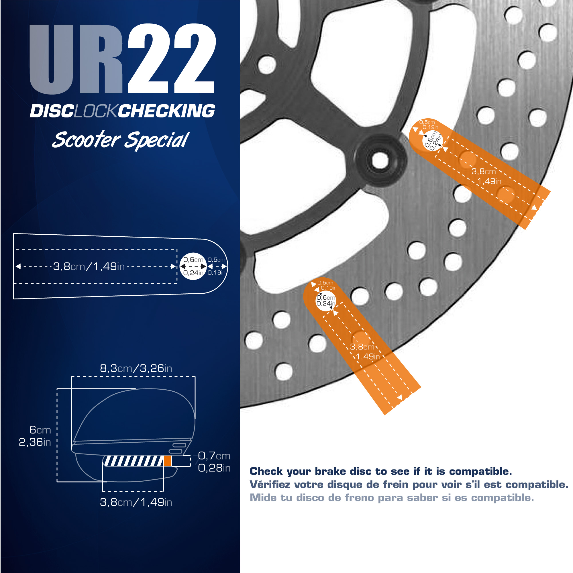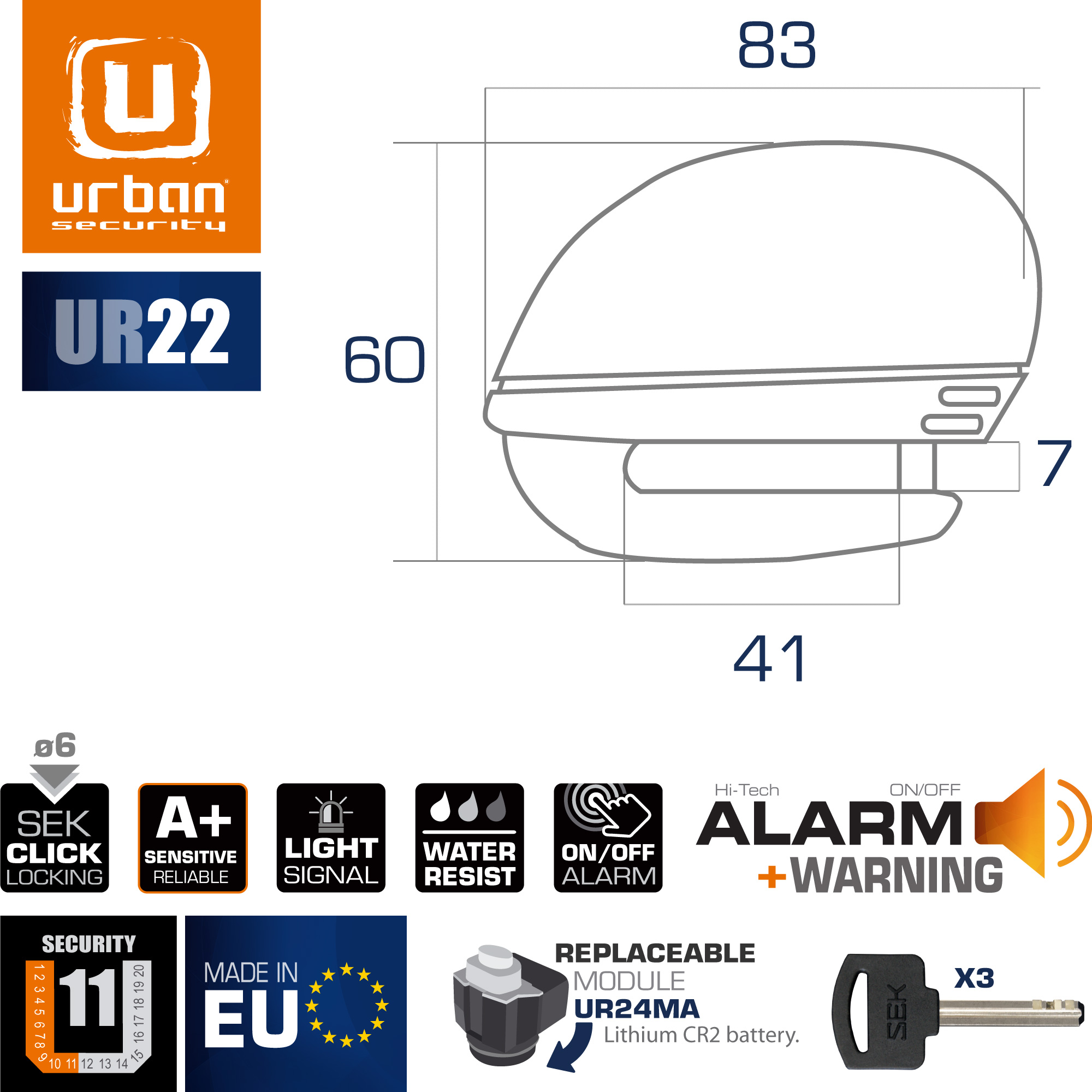 El URBAN UR22 incorpora un módulo electrónico remplazable (UR24MA) que utiliza una pila CR2, económica y fácil de encontrar, además es resistente al agua y gracias a su innovador diseño puedes decidir si activar la alarma o usarlo como un antirrobo mecánico tradicional dependiendo de la ocasión.