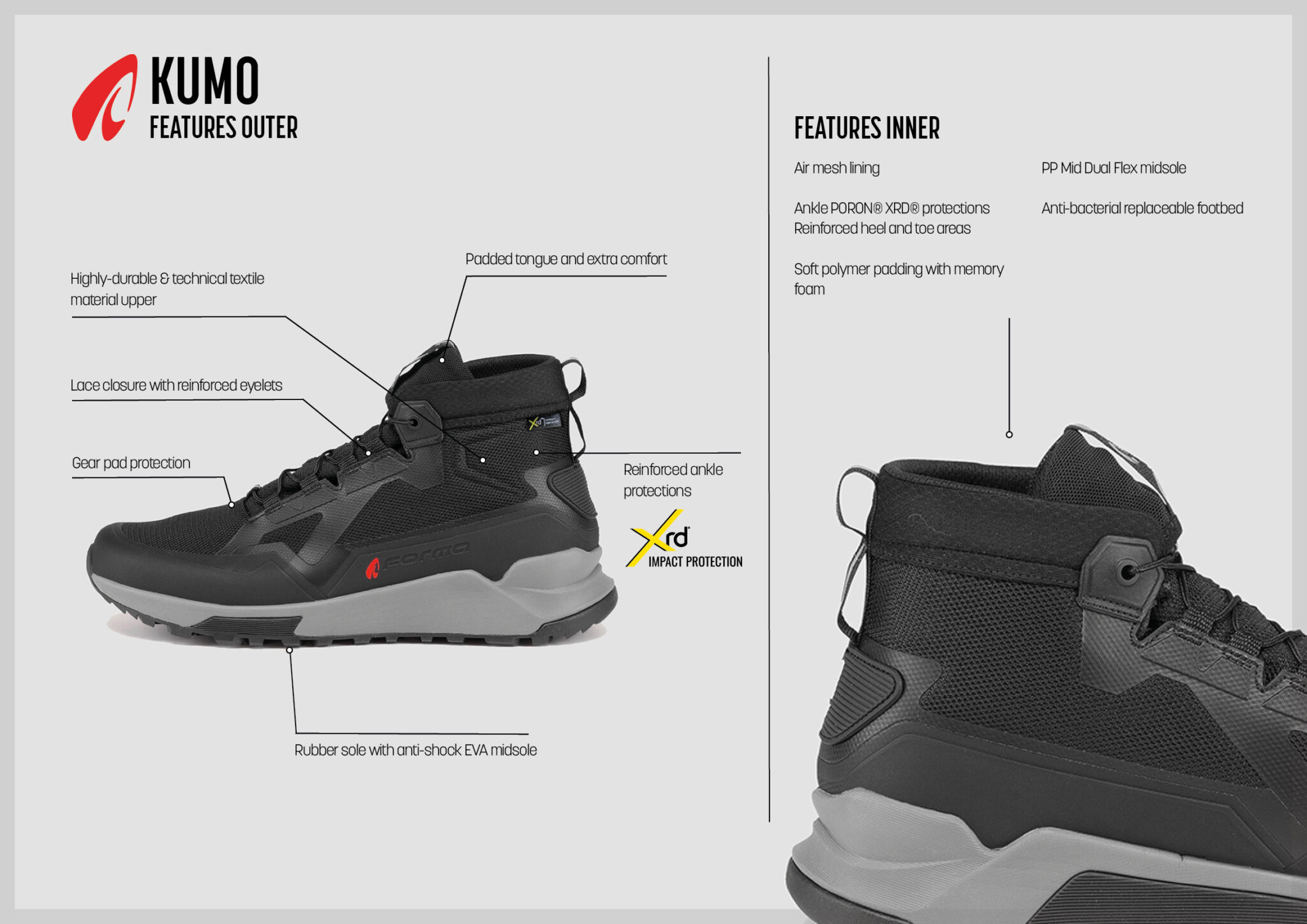 El Kumo es un calzado con un look juvenil e informal que combina la practicidad para el día a día con la elegancia y seguridad de un artículo con certificación CE. Sus líneas y su estilo deportivo a la vez que informal satisfacen las necesidades de un mercado cada vez más atento a la moda, pero también a la búsqueda de productos técnicos y de calidad. Sus características lo convierten en uno de los modelos más destacados de la categoría urbana.