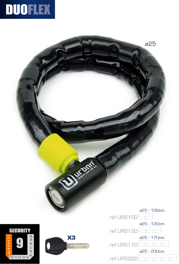 El URBAN DUOFLEX consiste en un resistente cable de acero que está protegido por casquillos y bolas de acero blindadas de diámetro 25mm, esto lo hace flexible pero resistente. Todo esto está recubierto por una funda plástica para evitar daños en la pintura de tu moto o tu llanta. Incluye tres llaves planas reversibles de seguridad.