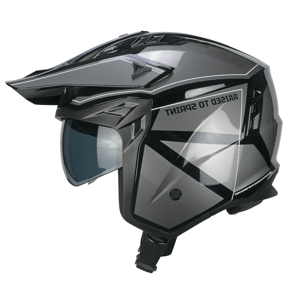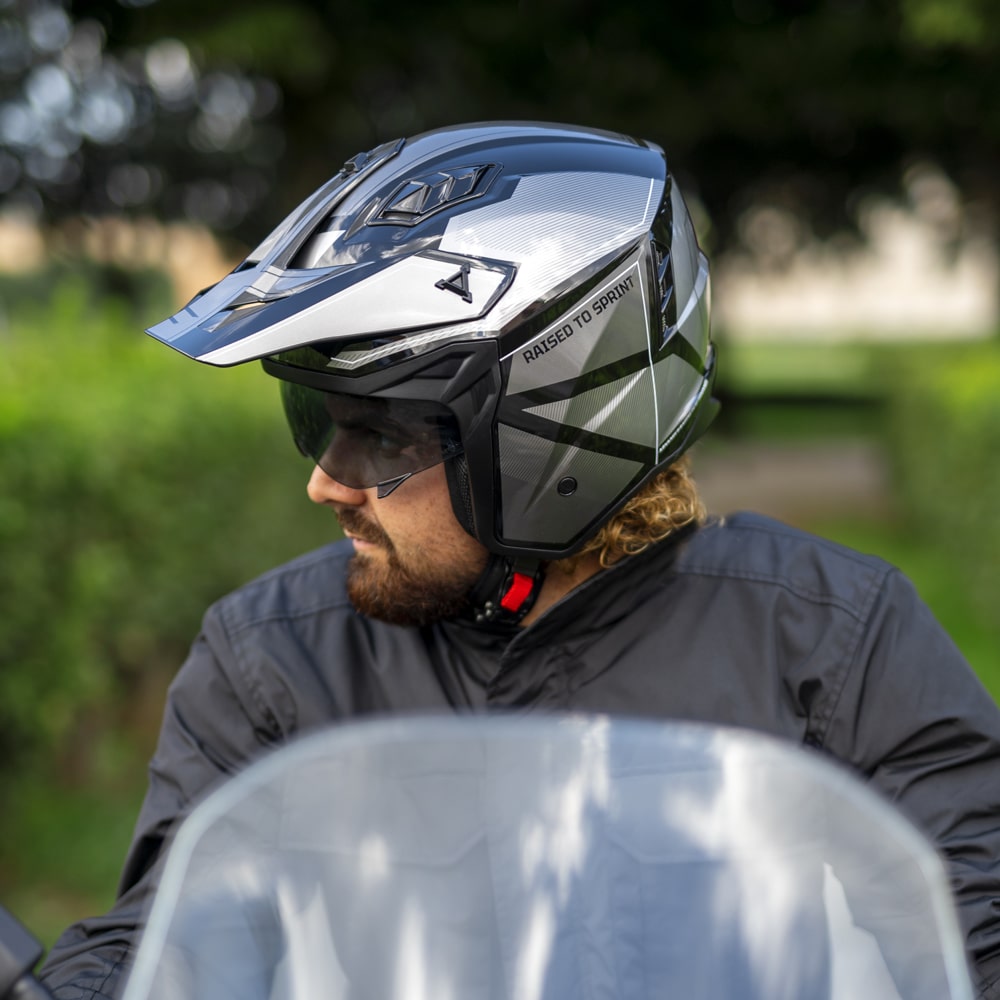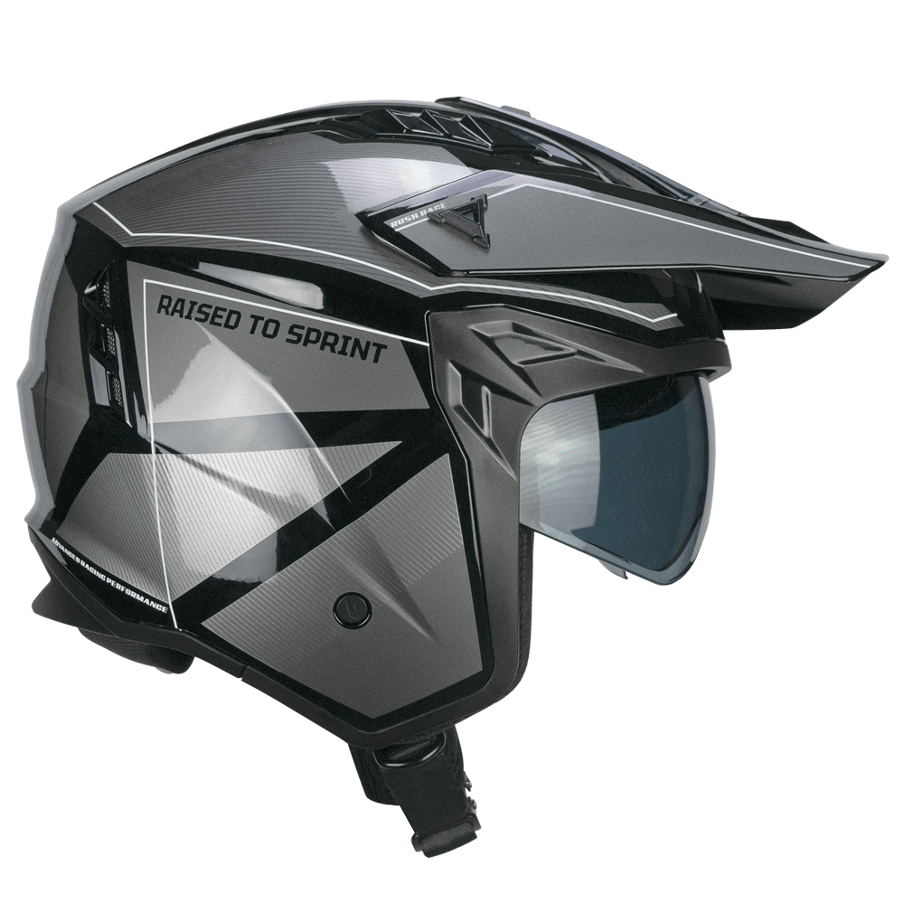Casco moderno con un diseño atractivo, el 155 RUSH se adapta a cualquier tipo de pista, de la carretera al cortafuegos. Fabricado con calota en HPT (High Performance Terpolymer) equipada con una visera parasol fácilmente desmontable gracias al kit de conversión jet incluido en el paquete. Este modelo está fabricado con una pantalla parasol interna multiclic y un Air Stream System con cuatro zonas de canalización de aire. Dispone de interiores termoformados hexagonales con tela ExtraCool con bandas de alta visibilidad, está diseñado para el uso de gafas y para albergar el intercomunicador aftermarket. El casco se completa con el anillo antirrobo, la hebilla micrométrica y el tope de correa elástico.