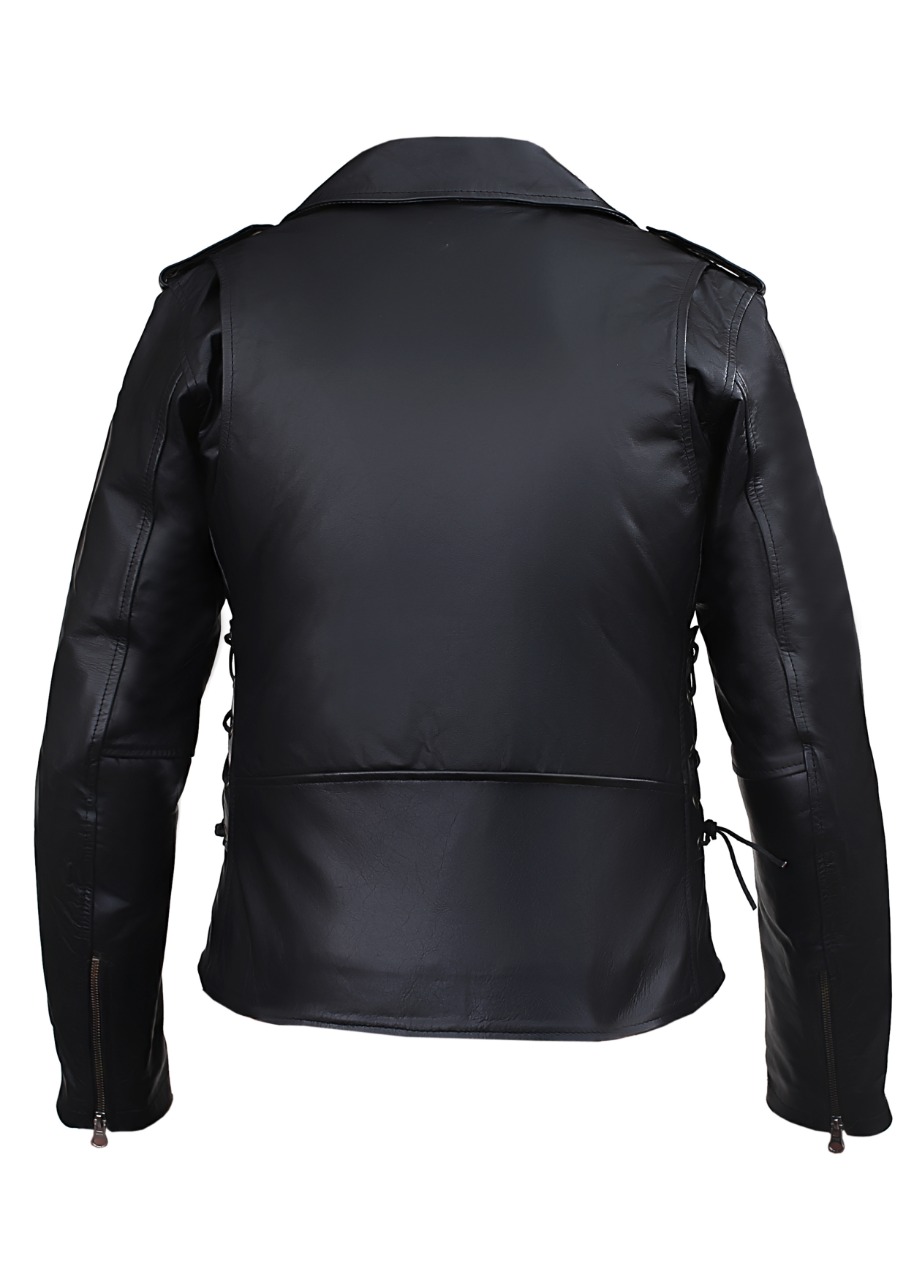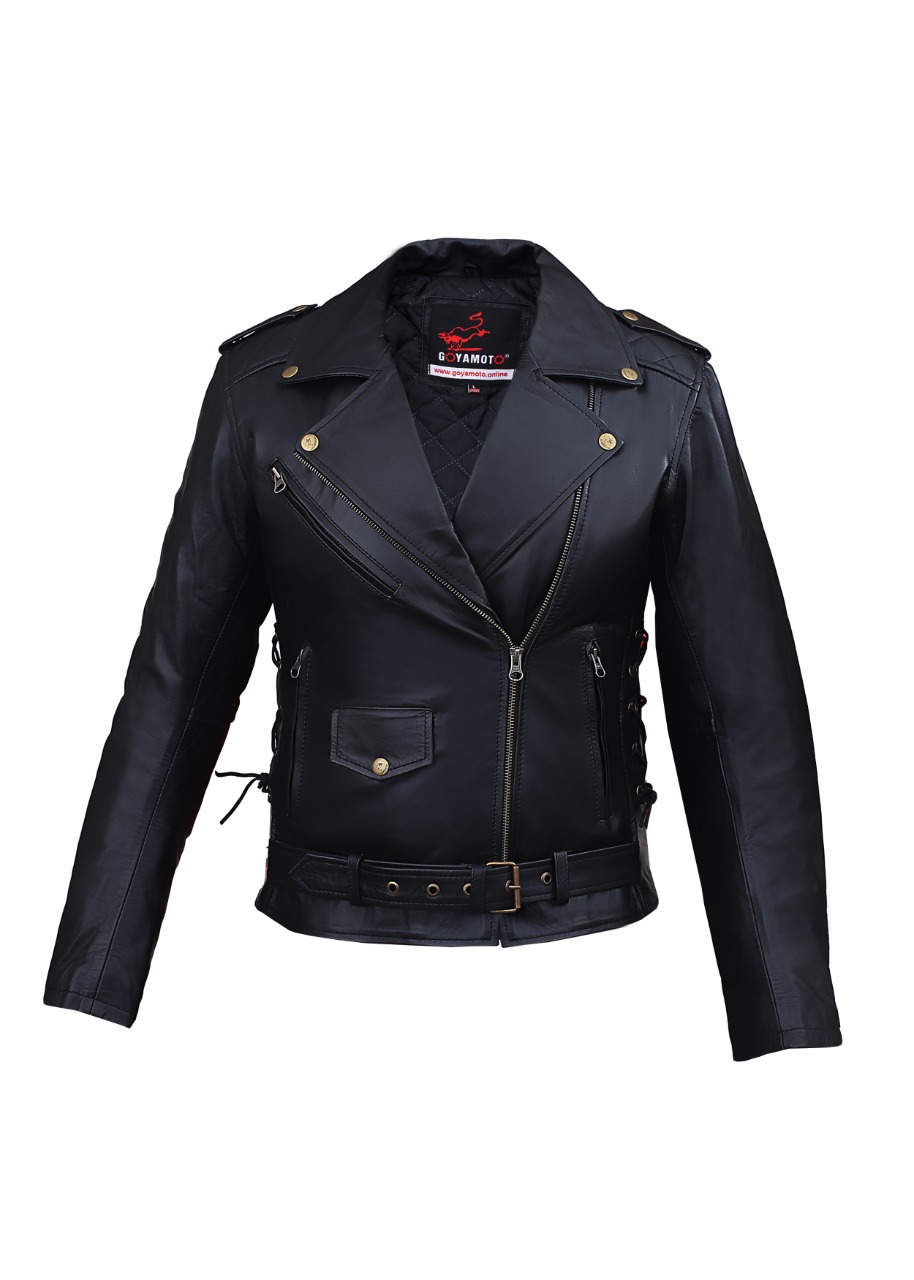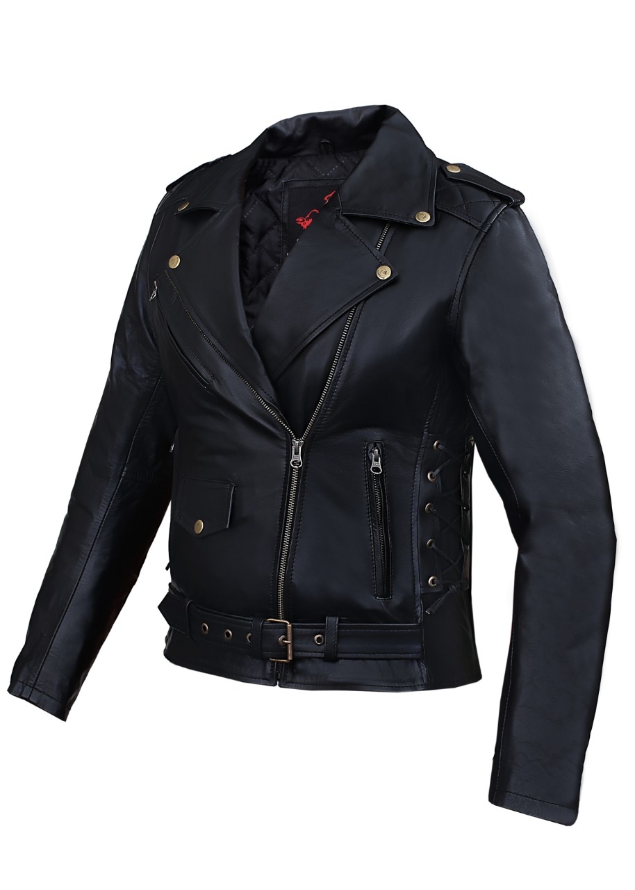 Chaqueta Lady de cuero cruzada para moto custom fabricada en piel de vacuno de maxima calidad.