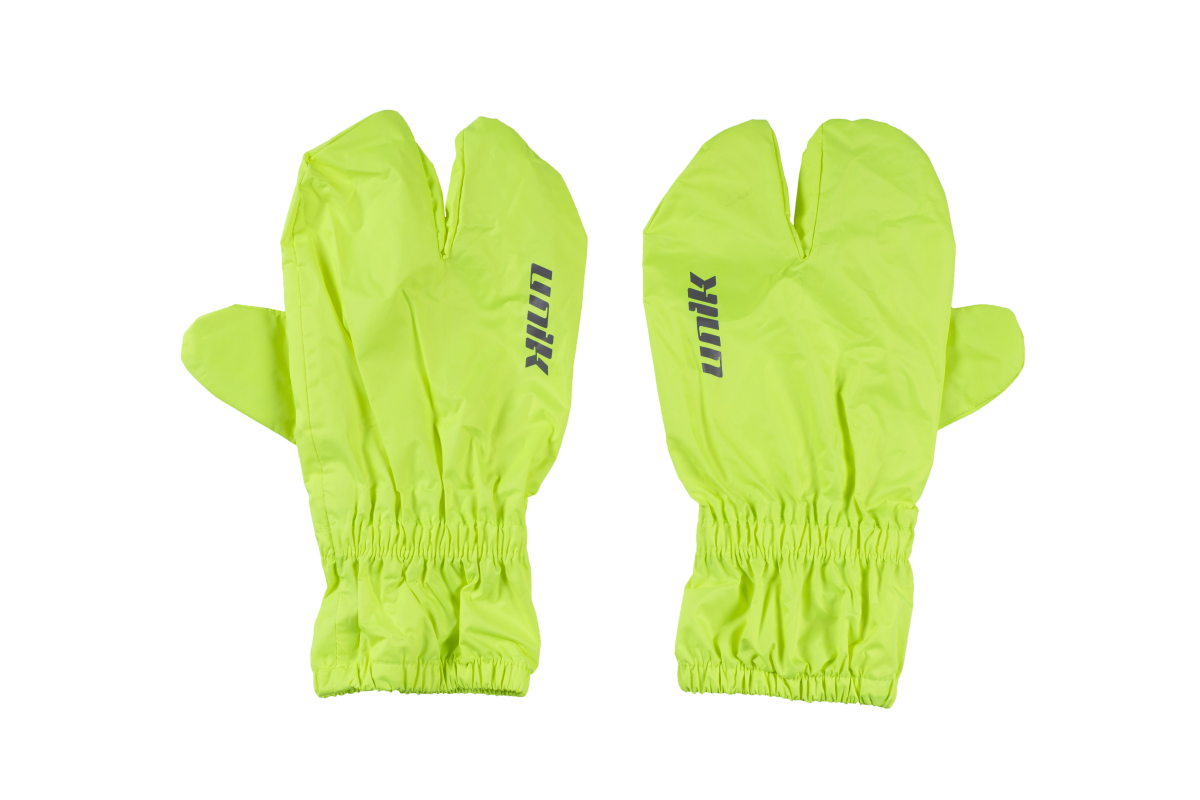 Cubreguantes impermeables para los días de lluvia. Tejido exterior de Poliéster. Ajuste elástico en puño y muñeca. Color amarillo flúor de alta visibilidad.