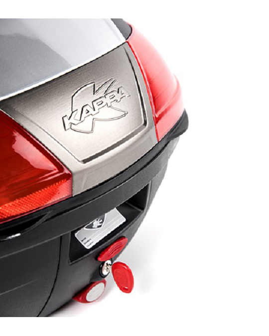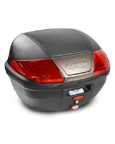 Baúl negro 40 Lts, tapa con textura carbono, embellecedor central en color titanio mate y catadióptricos rojos. Incluye parrilla K628 y kit de fijación universal. BAÚL MONOLOCK.