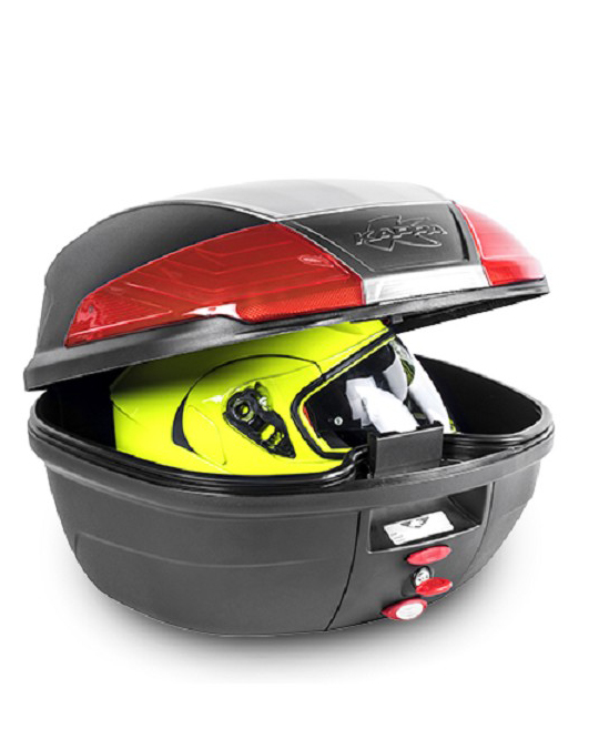 Baúl negro 40 Lts, tapa con textura carbono, embellecedor central en color titanio mate y catadióptricos rojos. Incluye parrilla y kit fijacion universal. Puede contener un casco modular.