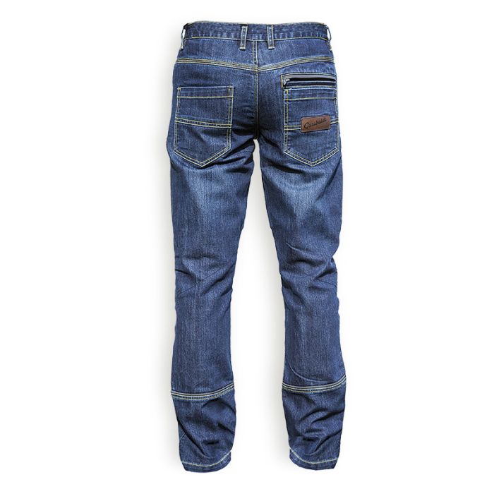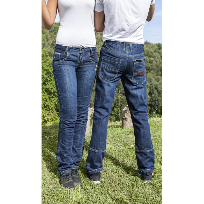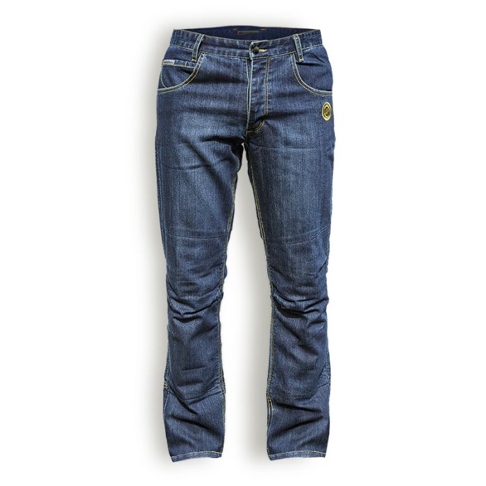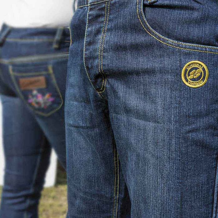 Estos tejanos son la perfecta combinación entre confort y seguridad, de estilo casual, informal y deportivo, son perfectos para quien utiliza la moto en la ciudad. Disponibles en la versión de corte “regular fit”, están realizados en cómodo algodón Denim, cosidos con hilo de kevlar y disponen de refuerzos interiores de fibras aramídicas situados estratégicamente en las zonas más expuestas, asiento, caderas y rodillas, que confieren una excelente resistencia a la abrasión y desgarro. 3 bolsillos delanteros de los cuales uno para las monedas y 3 traseros, uno con cremallera. Protecciones D30® en las rodillas y caderas homologadas EN 1621.1. Estas innovativas protecciones son particularmente flexibles al tacto pero por su estructura molecular son capaces de absorber mucha energía de impacto; flexibles cuando la energía transmitida es baja y rígidas cuando la energía transmitida es mayor. Logotipo Original Vintage bordado. Detalles reflectantes en bolsillo posterior y gemelos. Tallas: XS a XXXL.
