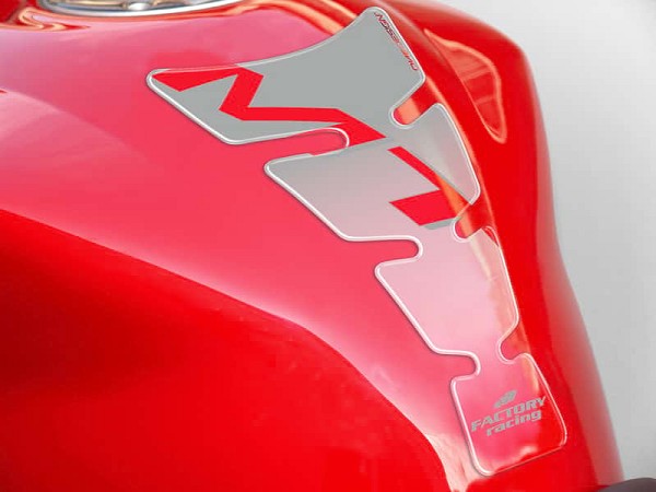 Tank pad with a standard shape but with the particularity that the motorcycle model is printed in the central part either in black or silver depending on the color of the tank pad. We have two colors: black and silver. We do not have specific tank protectors for all motorcycle models on the market, but for the most popular ones.